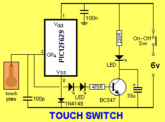 allows up to 4 touch sensors using a PIC12F629. The output of each touch