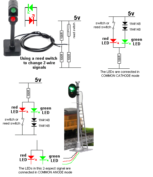 The signal is normally red and when the loco activates the reed switch, the first 555 produces a timing of about 10 seconds so the loco has to stop and wait at the signal and when the time has expired, the second 555 is triggered and the green light shows for 10 seconds and then the red appears again. All this has been done with 2 x 555 IC's. The 2-aspect signal is not a normal signal but comes as a kit from Talking Electronics for $5.00 usd as the LEDs are connected differently to standard models.