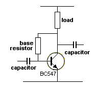 points to understand is the charging of the 10u. At the beginning it gets charged in the reverse direction by the 330k and when the base of the NPN sees 0.65v, it starts to turn ON. This causes the PNP to turn ON and the collector pulls the top of the speaker towards the positive rail. This action pushes the charge on the 10u into the base of the NPN transistor because the positive lead of the 10u rises and raises the negative lead. This immediately turns the NPN on MORE and very quickly both transistors are fully turned ON. As the positive lead of the 10u rises a point is reached where the 10u changes from pushing its charge into the base to a point where it starts to charge in the forward direction because the positive lead is now higher than the negative lead. During this time the current continues to flow into the base and that's why the NPN continues to stay fully turned ON. As the 10u charges, the current starts to decrease and a point is reaches where the flow of current into the base does not k\keep the NPN fully turned ON. The NPN starts to turn OFF slightly and this is passed to the positive lead o f the 10u. The 10u "drops" slightly and this very quickly turns OFF the NPN and and the PNP. They both turn off fully and now the base is a few volts lower than the 0v rail. The 330k starts to remove the charge on the10u and eventually charge it to 0.65v to turn on the NPN to start the next cycle. |