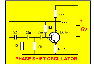 have a FREQUENCY DETERMINING NETWORK. In the two oscillators above, the FREQUENCY DETERMINING NETWORK is the TANK CIRCUIT. The feedback capacitor does not have any effect on the frequency (only a small effect when say it is doubled or halved). In the Phase Shift Oscillator, the feedback components DETERMINE THE FREQUENCY. |