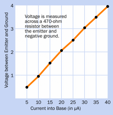 Figure 2-9. Emitter voltage varies almost linearly with base current, in a 2N2222 transistor. This graph was derived