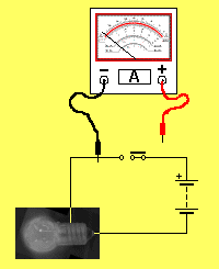 Clever Meter THE AMMETER The ammeter is placed in SERIES with one lead of a circuit. It must be placed around the correct way so the needle moves up-scale. An ammeter is really a microamp-meter (it's called a movement - generally a 0-30 micro-amp movement) with a SHUNT (a thick piece of wire) across the two terminals. To cover the range of current used in electronic circuits, there are basically 3 types of amp-meters (or 3 ranges): 0 - 1 amp (0 - 1A) 0 - 1milliamp (0 - 1mA) 0 - 1 microamp (0 - 1uA) In each range you can get many different scales, such as: 0 - 1A, 0 - 10A, and higher 0 - 10mA, 0 - 100mA, 0-250mA, 0-500mA 0 - 1uA, 0 - 100uA, 0 - 500uA (0 - 1uA uses a 1uA movement) ![]() Connecting an AMMETER An ammeter is never connected across a battery or the supply rails of a project as this will create a SHORT-CIRCUIT and a large current will flow to either burn-out the meter or bend the pointer. However, you need to know which way to connect a meter so that it reads up-scale. This is how you do it: Remember this simple fact: Current flows through the meter from the +ve lead to the -ve lead and this means the leads must be placed so that the positive lead sees the higher voltage. Do not place an ammeter ACROSS a component. This will generally cause damage and in most cases it will not tell you anything. You can check to see how much current is flowing through a circuit by flicking one lead of the ammeter onto the circuit and watching the needle. If it moves up-scale very quickly, you know excess current is flowing and a higher range should be chosen. If the needle moves fairly slowly up-scale, the chosen range may be correct. Always start with a high range (0-1Amp for example) and if the needle moves a very small amount up the scale, another range can be chosen. DON'T FORGET: Placing an ammeter on a circuit is a very dangerous thing because it is similar to playing with a jumper lead and represents a lead with a very small resistance. It is very easy to slip off a component and create a short-circuit. You have to be very careful. Ammeters have to be connected across a "gap" or "cut" in a circuit and the easiest way to get a gap is across the on/off switch. The animation below shows how to connect an ammeter: