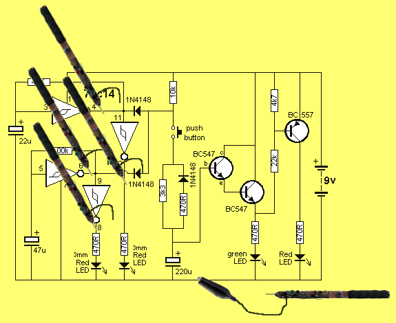 each component connected to the 9v rail and a LOW for the 0v rail.