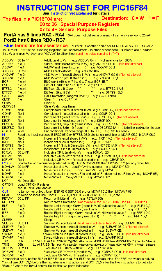 INSTRUCTIONS ADDWF PCL,1 ADDWF 02,1 Alter the program counter to create a jump CLRF INDF,1 CLRF 00,1 Clear INDIRECT file INCF FSR,1 INCF 04,1 Increment the File Select Register INTCON address is either 0Bh or 8Bh - it is mapped at both locations. BCF INTCON,RBIF Clear RB<7:4> Port-change Interrupt flag BSF INTCON,RBIF Set RB<7:4> Port-change Interrupt flag BCF INTCON,RBIE Disables the Port-change Interrupt BSF INTCON,RBIE Enables the Port-change Interrupt BCF INTCON,INTE Disables the RB0/INT Interrupt BSF INTCON,INTE Enables the RB0/INT Interrupt BCF INTCON,T0IE Disables the TMR0 Interrupt BSF INTCON,T0IE Enables the TMR0 Interrupt BCF INTCON,EEIE Disables the EE write complete Interrupt BSF INTCON,EEIE Enables the EE write complete Interrupt BCF INTCON,GIE Disables all Interrupts BSF INTCON,GIE Enables all un-masked Interrupts OPTION address is 81h - use the word OPTION OPTION,0 OPTION,1 OPTION,2 Prescaler Rate Select Bits
