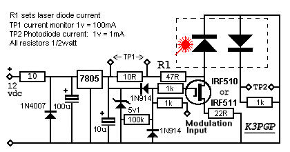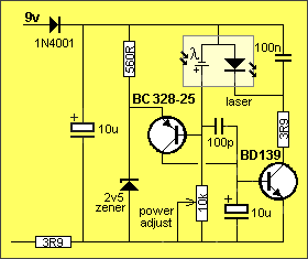 Laser diode current is set via R1. Typical values are 39 to 47 ohms for 5 mw