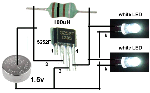voltage is increased to 3.6v and the current is delivered to two LEDs,