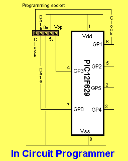 PICkit2v2.exe and ".inc files" The following diagram shows a SURFACE MOUNT PC Board with a PIC12F629 chip and IN-CIRCUIT PROGRAMMING socket made from 5 tinned copper wires.
