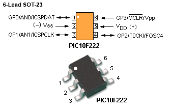 The circuit states a PIC10F2xx is used and the pinout is shown below