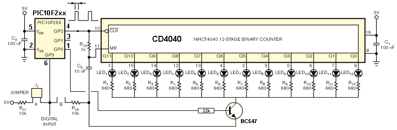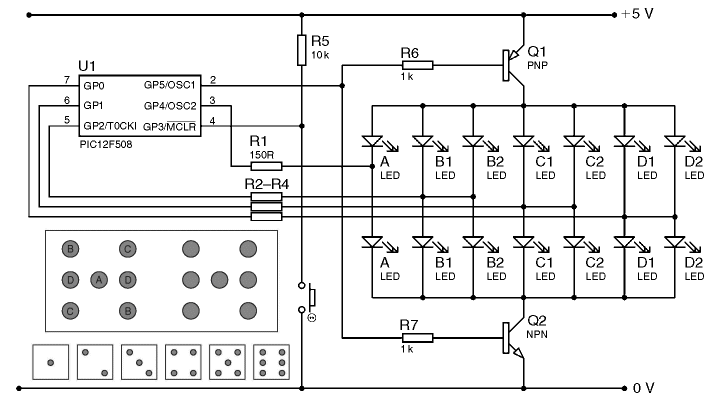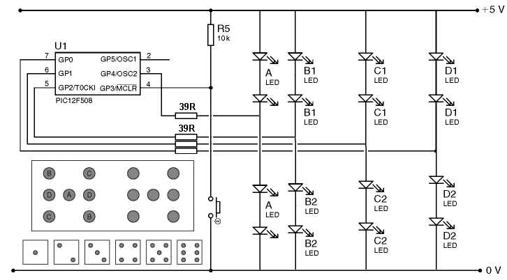 The project uses the 6pin PIC10F202 (or similar) micro with 3 in-out lines and one input line.