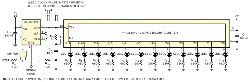 The program detects either dot mode or bar mode by placing a jumper between 0v and GP3 or +5v and GP3.