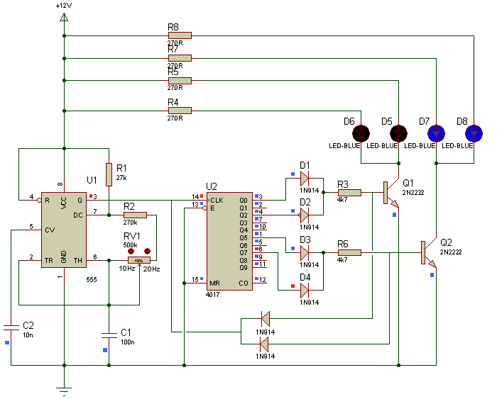 the 4017 clocks to the next output. The 10u and 22k also prevent the