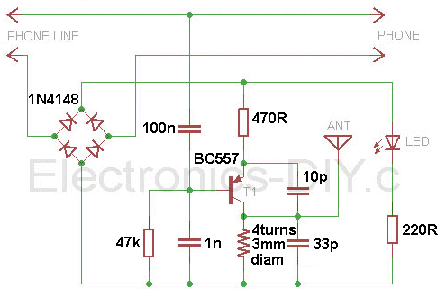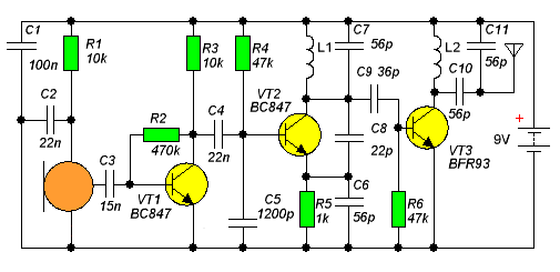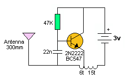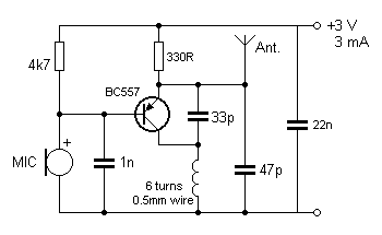 circuit takes about 7mA and produces a range of about 200 - 400metres.